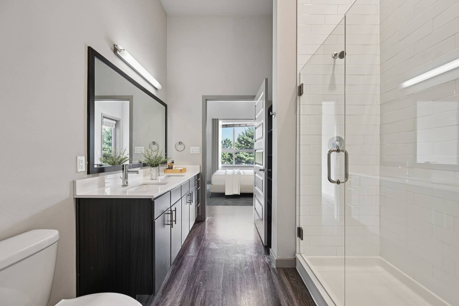 - Designer bathrooms featuring quartz vanities and frameless glass showers.